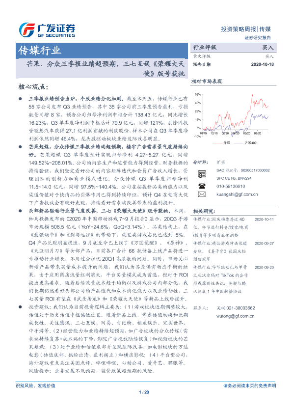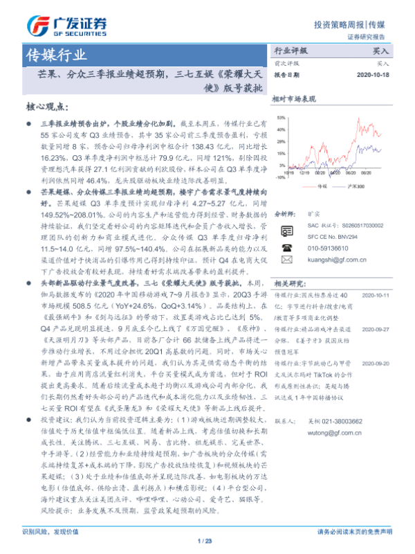 【广发证券】【20201018】20201018-广发证券-传媒行业投资策略周报:芒果、分众三季报业绩超预期,三七互娱《荣耀大天使》版号获批-23页