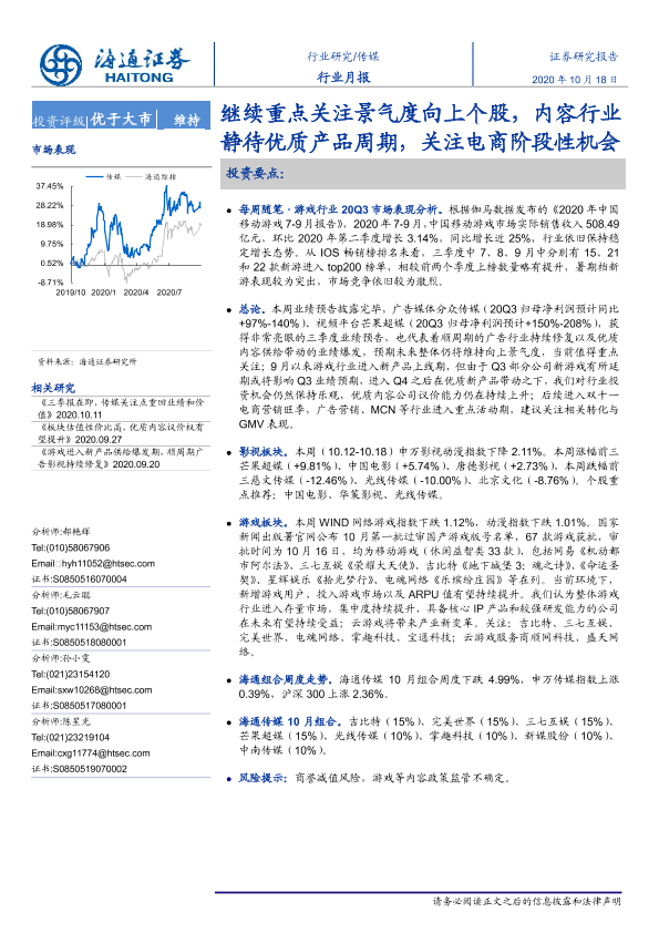 【海通证券】【20201018】20201018-海通证券-传媒行业月报:继续重点关注景气度向上个股,内容行业静待优质产品周期,关注电商阶段性机会-12页