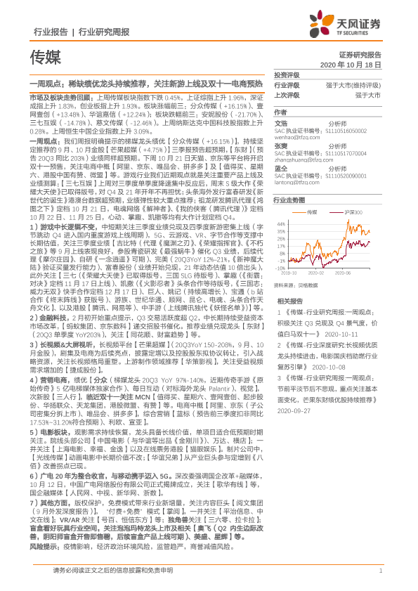 【天风证券】【20201018】20201018-天风证券-传媒一周观点:稀缺绩优龙头持续推荐,关注新游上线及双十一电商预热-24页
