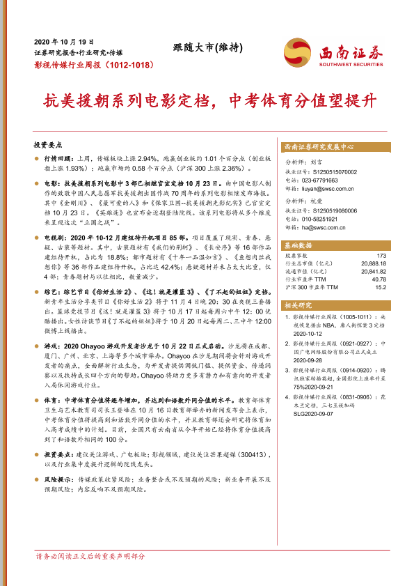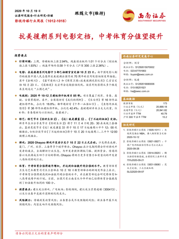【西南证券】【20201019】20201019-西南证券-影视传媒行业周报:抗美援朝系列电影定档,中考体育分值望提升-18页