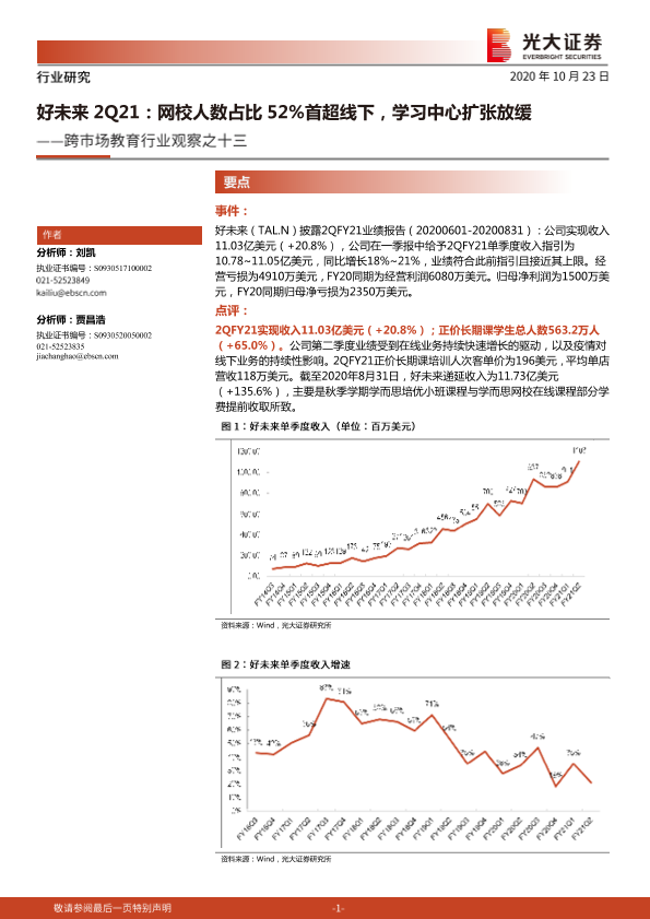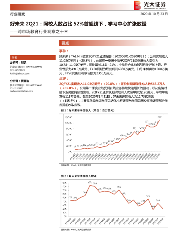 【光大证券】【20201023】跨市场教育行业观察之十三:好未来2Q21:网校人数占比52%首超线下,学习中心扩张放缓-4页
