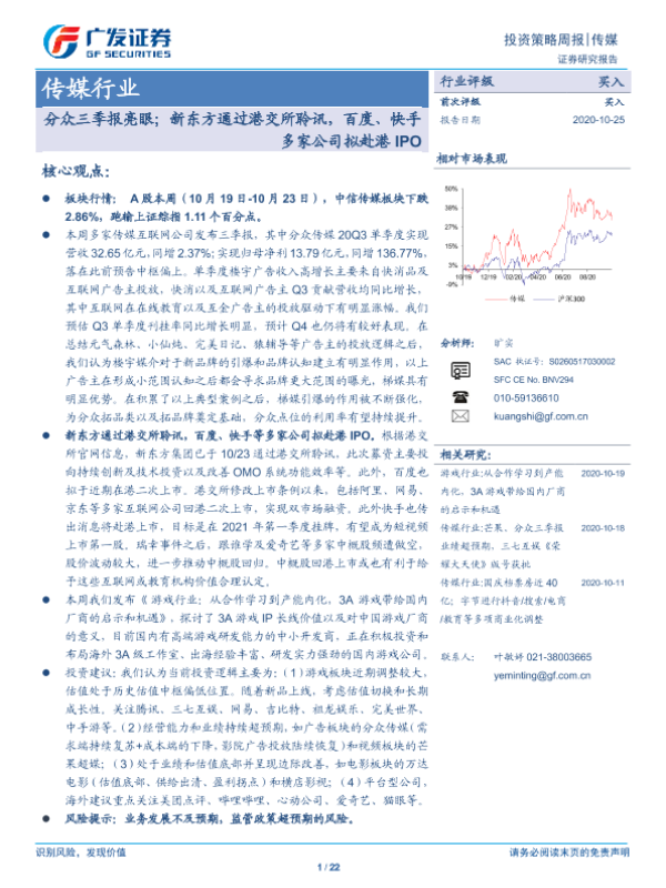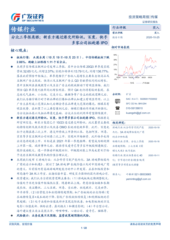 【广发证券】【20201025】20201025-广发证券-传媒行业投资策略周报:分众三季报亮眼;新东方通过港交所聆讯,百度、快手多家公司拟赴港IPO-22页