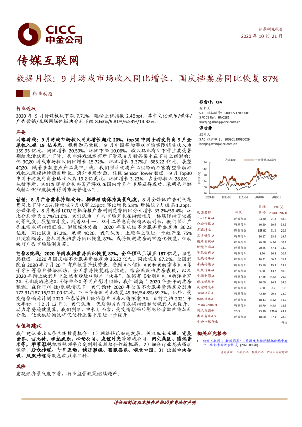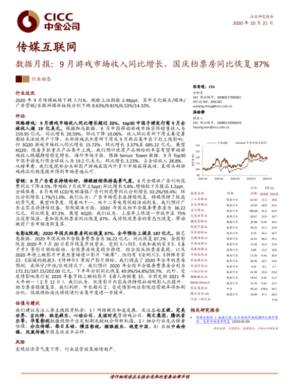 【中金公司】【20201021】20201021-中金公司-传媒互联网数据月报:9月游戏市场收入同比增长,国庆档票房同比恢复87%-19页
