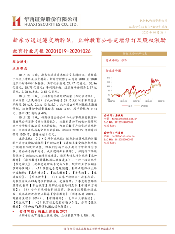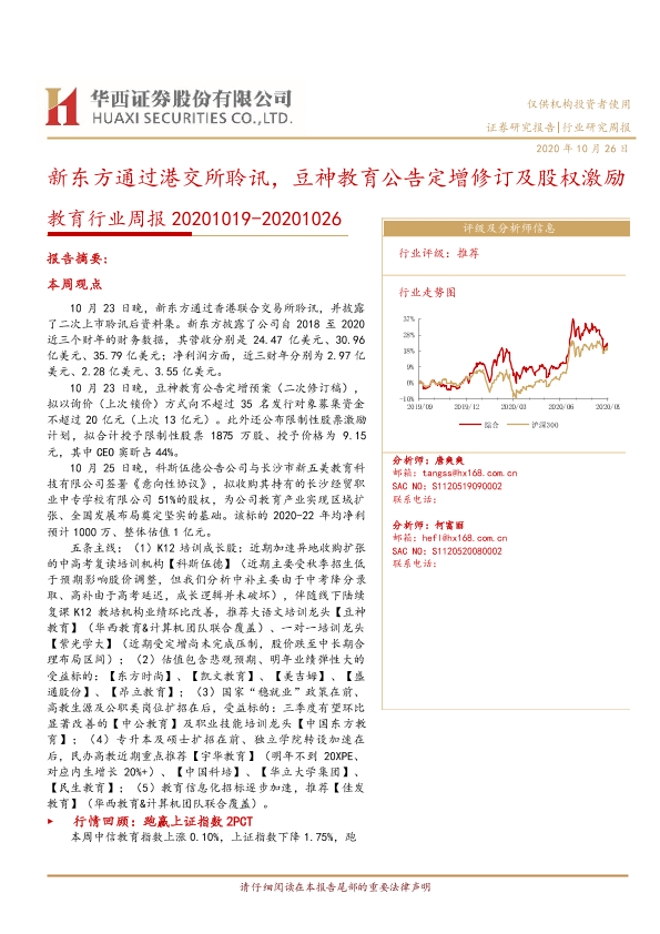 【华西证券】【20201026】20201026-华西证券-教育行业周报:新东方通过港交所聆讯,豆神教育公告定增修订及股权激励-18页