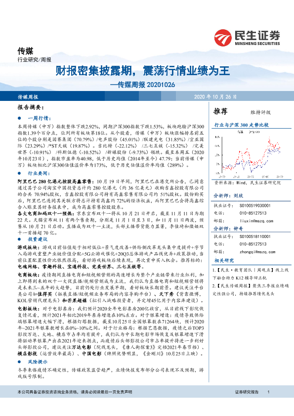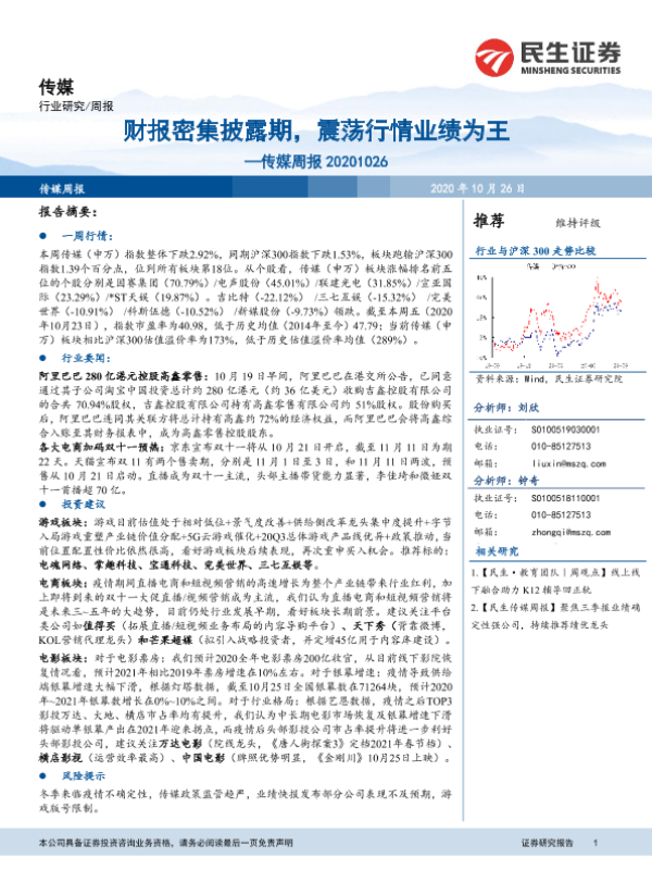 【民生证券】【20201026】20201026-民生证券-传媒周报:财报密集披露期,震荡行情业绩为王-17页