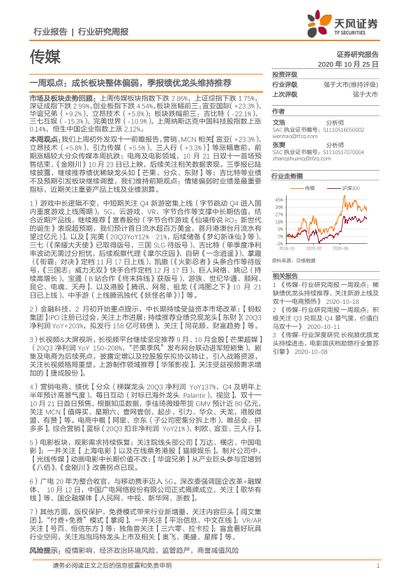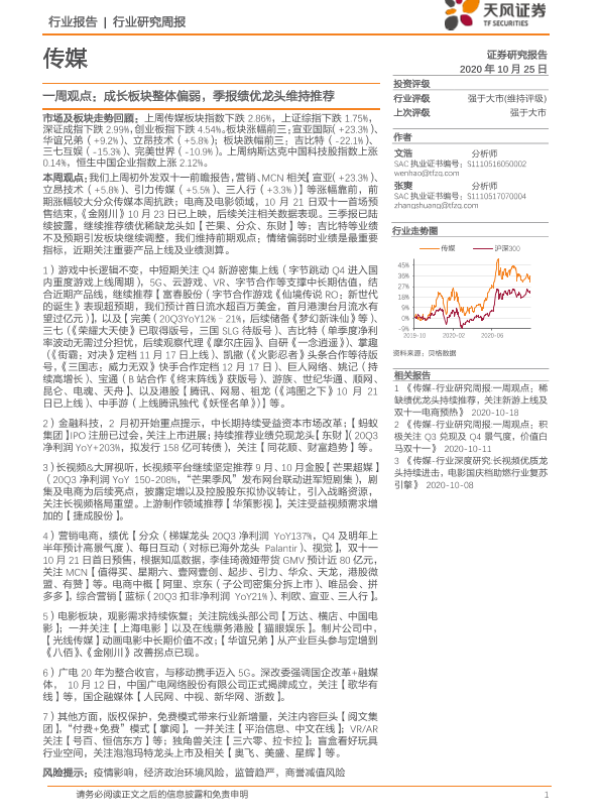 【天风证券】【20201025】20201025-天风证券-传媒一周观点:成长板块整体偏弱,季报绩优龙头维持推荐-26页
