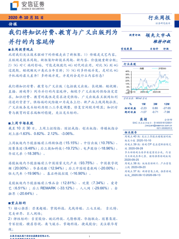 【安信证券】【20201031】20201031-安信证券-传媒行业周报:我们将知识付费、教育与广义出版列为并行的内容延伸-16页