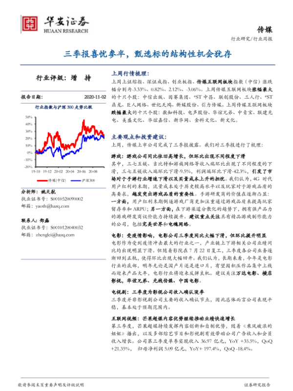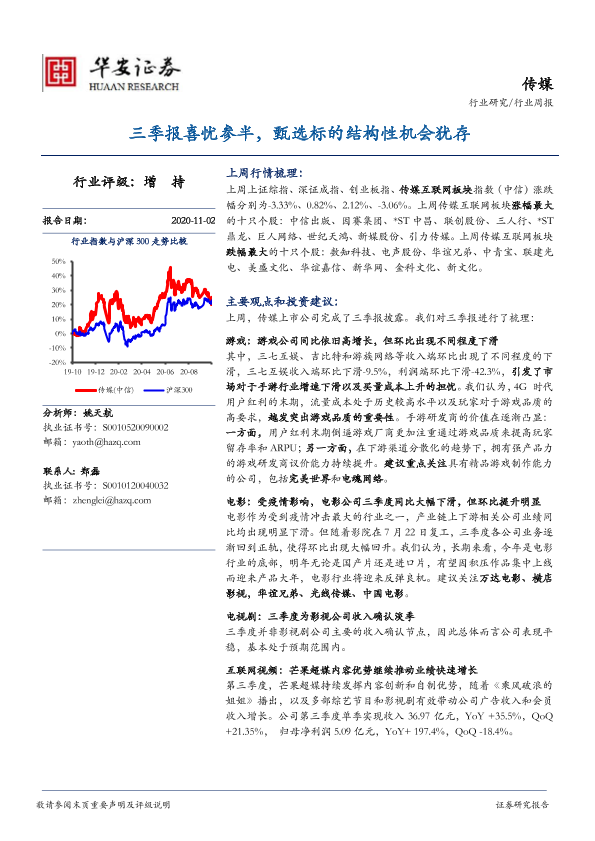 【华安证券】【20201102】20201102-华安证券-传媒行业周报:三季报喜忧参半,甄选标的结构性机会犹存-23页