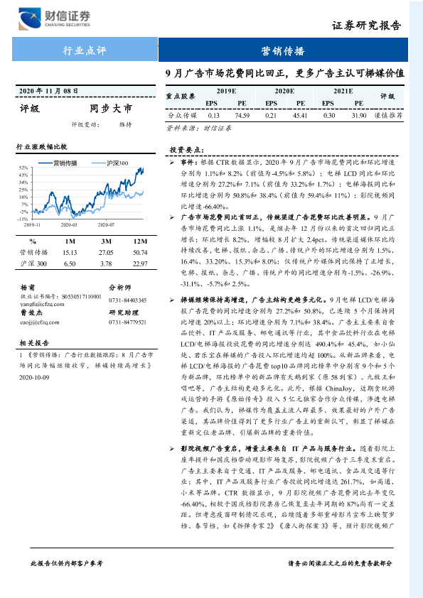 【财信证券】【20201108】20201108-财信证券-营销传播行业点评:9月广告市场花费同比回正,更多广告主认可梯媒价值-3页