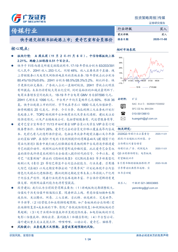 【广发证券】【20201108】20201108-广发证券-传媒行业:快手递交招股书拟赴港上市;爱奇艺宣布会员涨价-24页
