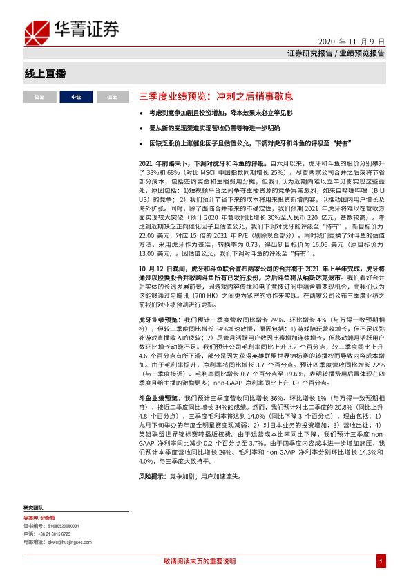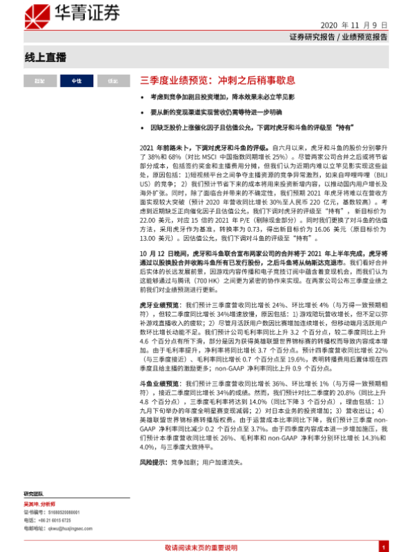业绩预览 合并分析 斗鱼 直播行业 虎牙