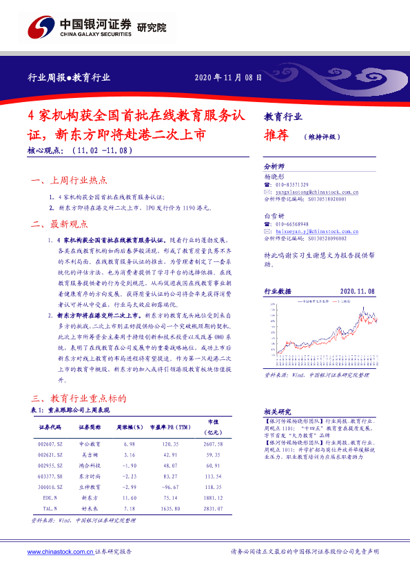 【银河证券】【20201108】20201108-中国银河-教育行业周报:4家机构获全国首批在线教育服务认证,新东方即将赴港二次上市-17页