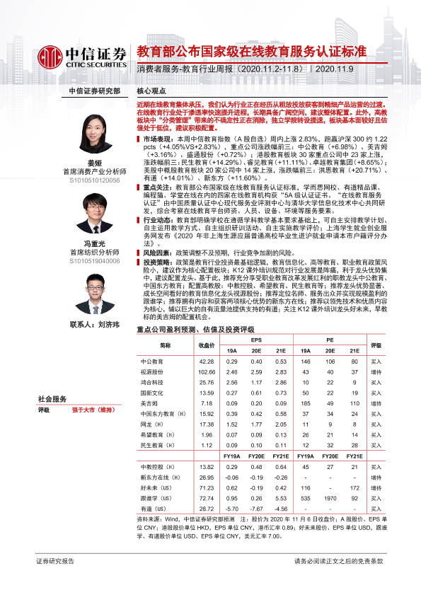 【中信证券】【20201109】消费者服务-教育行业周报:教育部公布国家级在线教育服务认证标准-10页