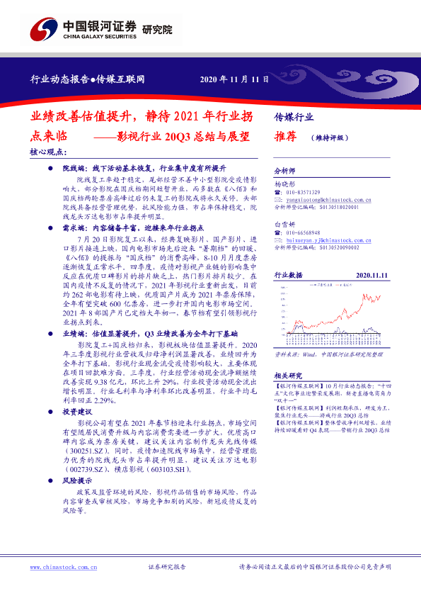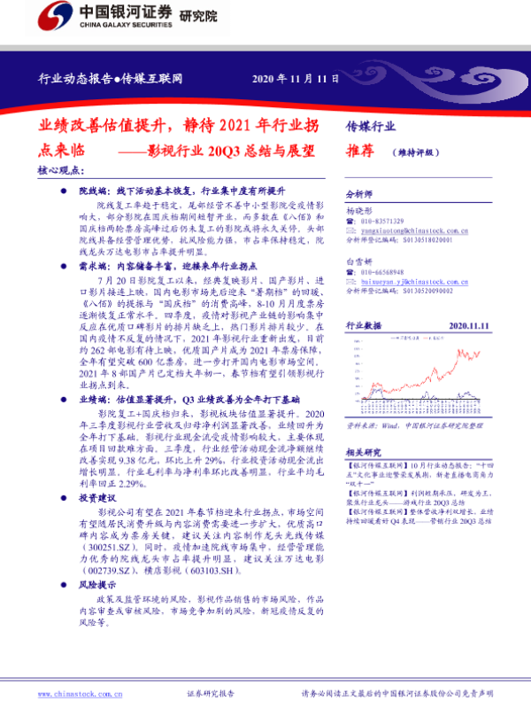 【银河证券】【20201111】影视行业20Q3总结与展望:业绩改善估值提升,静待2021年行业拐点来临-16页