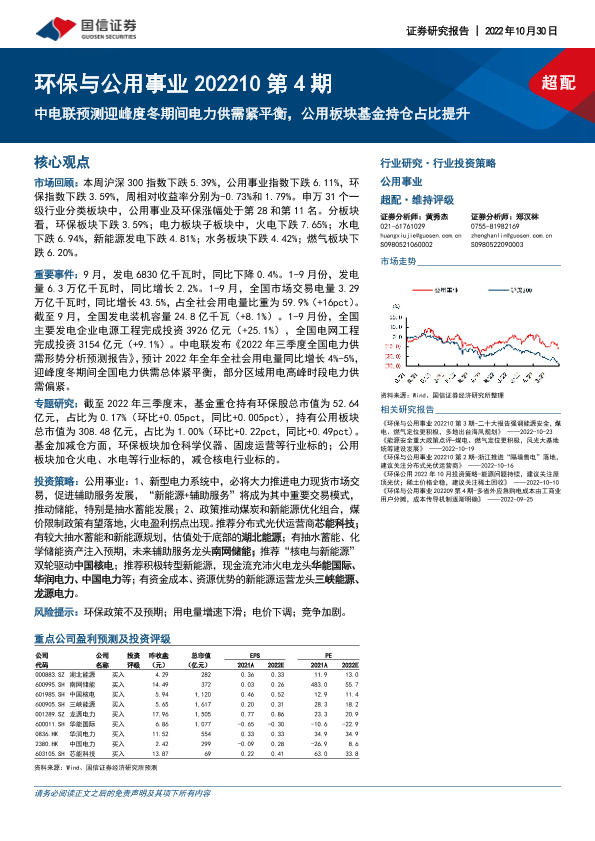 【国信证券】【20221030】环保与公用事业行业202210第4期:中电联预测迎峰度冬期间电力供需紧平衡,公用板块基金持仓占比提升-39页