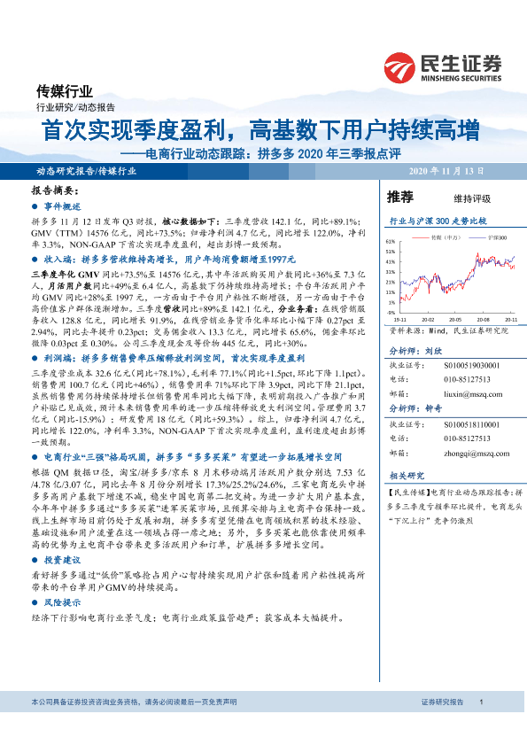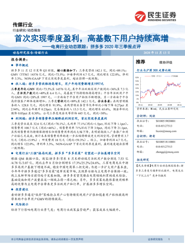 【民生证券】【20201113】电商行业动态跟踪:拼多多2020年三季报点评-首次实现季度盈利,高基数下用户持续高增-9页