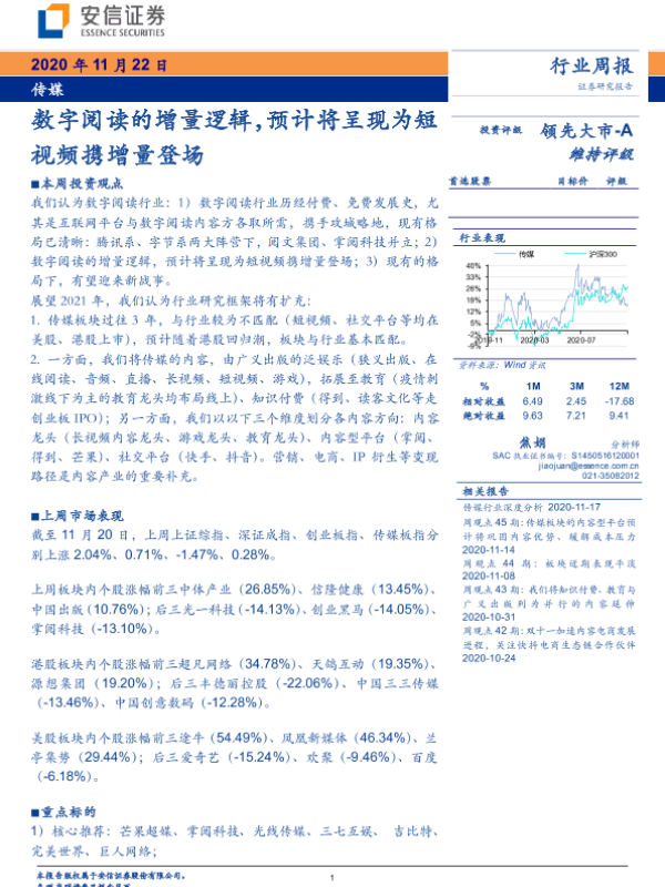 【安信证券】【20201122】传媒行业周报:数字阅读的增量逻辑,预计将呈现为短视频携增量登场-15页