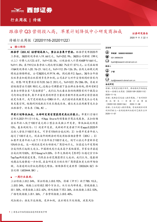 【西部证券】【20201122】传媒行业周报:跟谁学Q3营销投入高,苹果计划降低中小研发商抽成-14页
