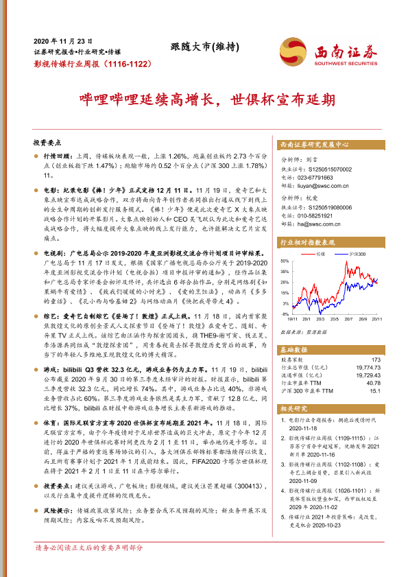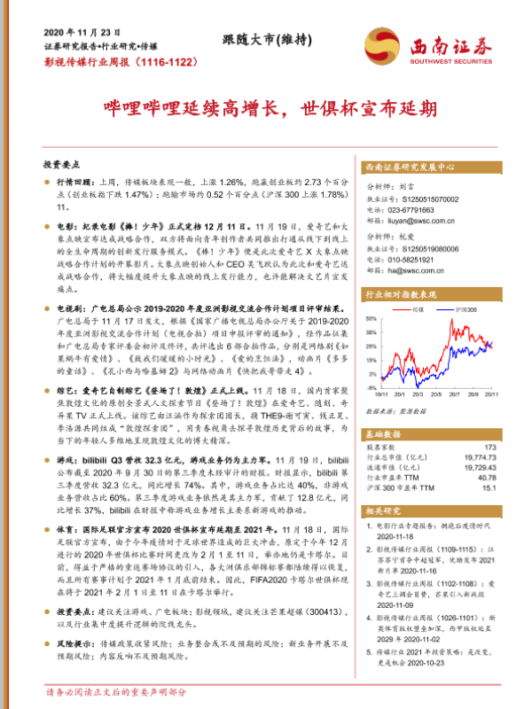 【西南证券】【20201123】20201123-西南证券-影视传媒行业周报:哔哩哔哩延续高增长,世俱杯宣布延期-21页