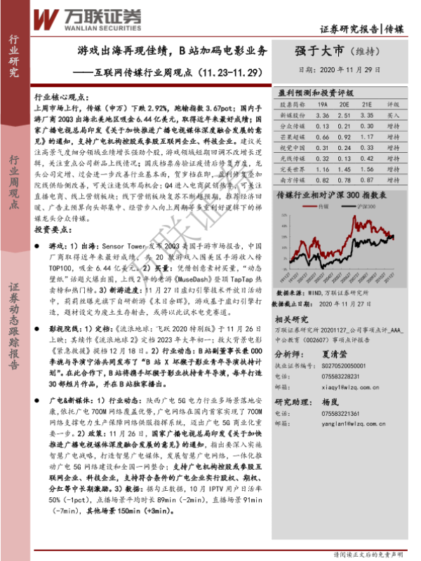 【万联证券】【20201129】互联网传媒行业周观点:游戏出海再现佳绩,B站加码电影业务-15页