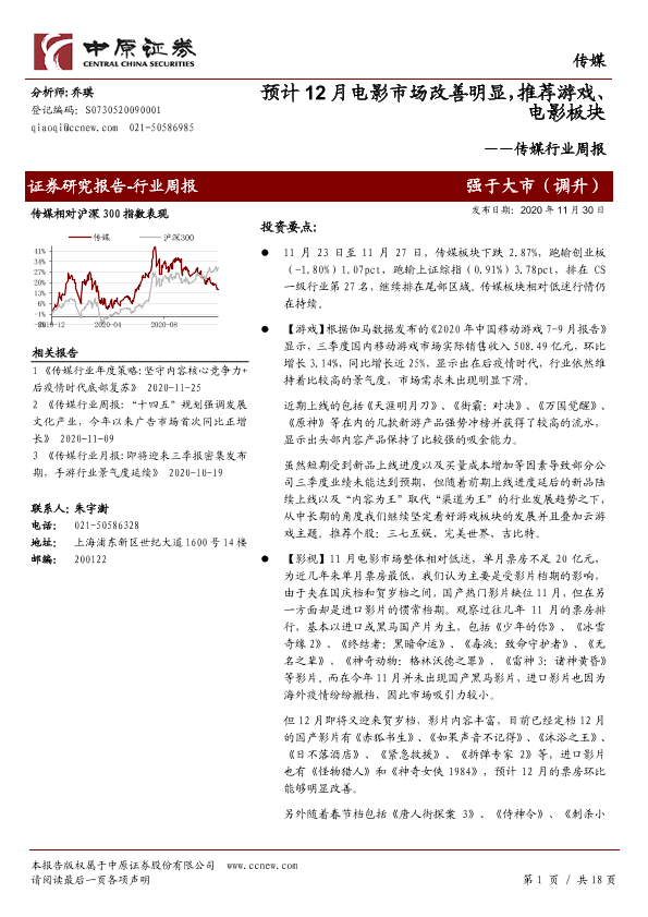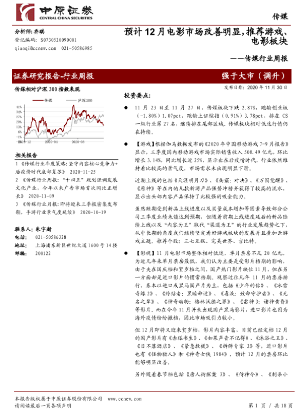 【中原证券】【20201130】20201130-中原证券-传媒行业周报:预计12月电影市场改善明显,推荐游戏、电影板块-18页