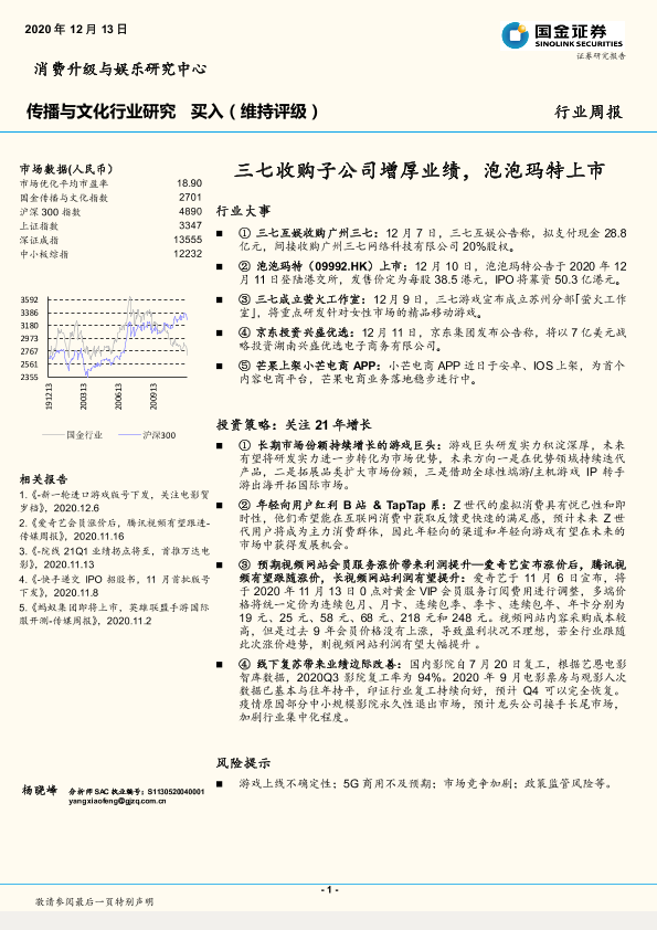 【国金证券】【20201213】传播与文化行业研究:三七收购子公司增厚业绩,泡泡玛特上市-11页