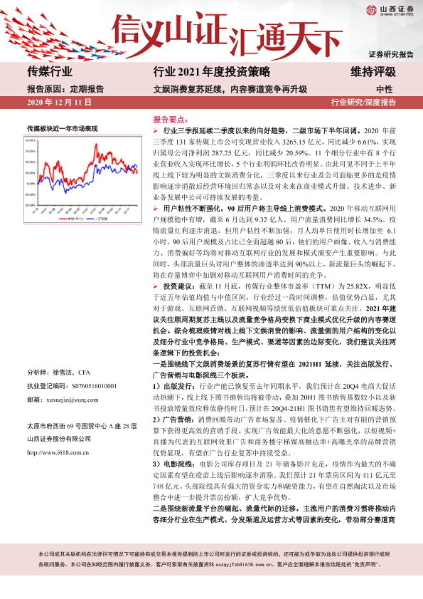 【山西证券】【20201211】20201211-山西证券-传媒行业2021年度投资策略:文娱消费复苏延续,内容赛道竞争再升级-65页