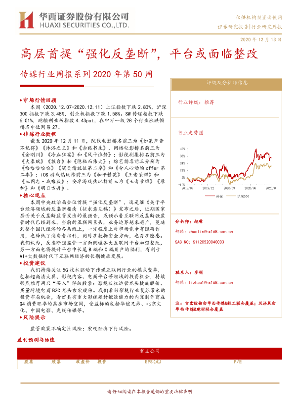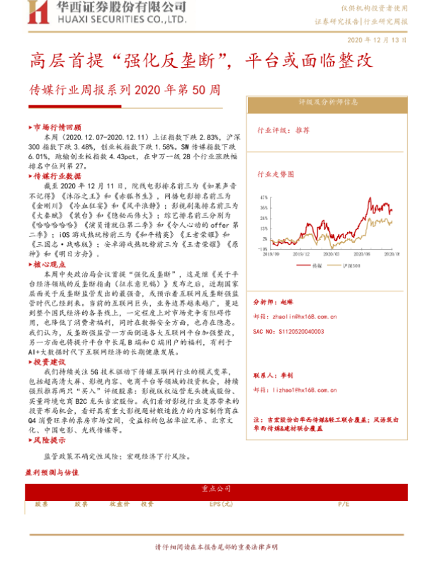 【华西证券】【20201213】20201213-华西证券-传媒行业周报系列2020年第50周:高层首提“强化反垄断”,平台或面临整改-17页