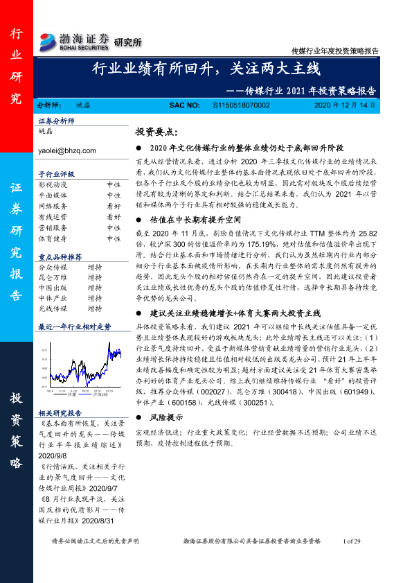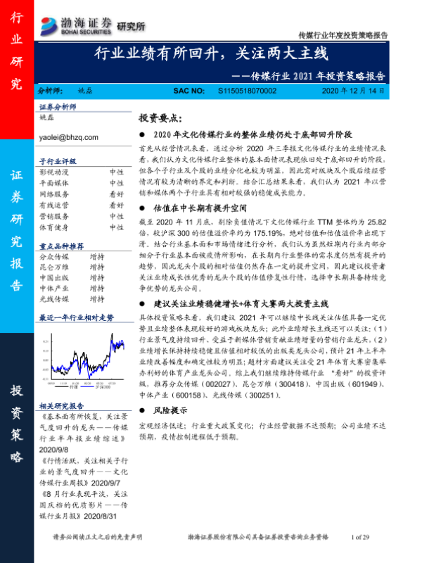【渤海证券】【20201214】传媒行业2021年投资策略报告:行业业绩有所回升,关注两大主线-29页