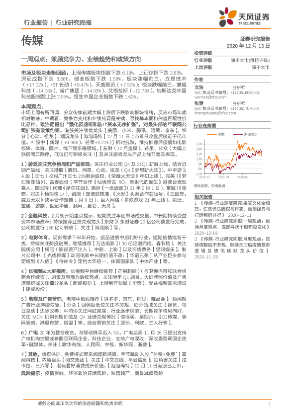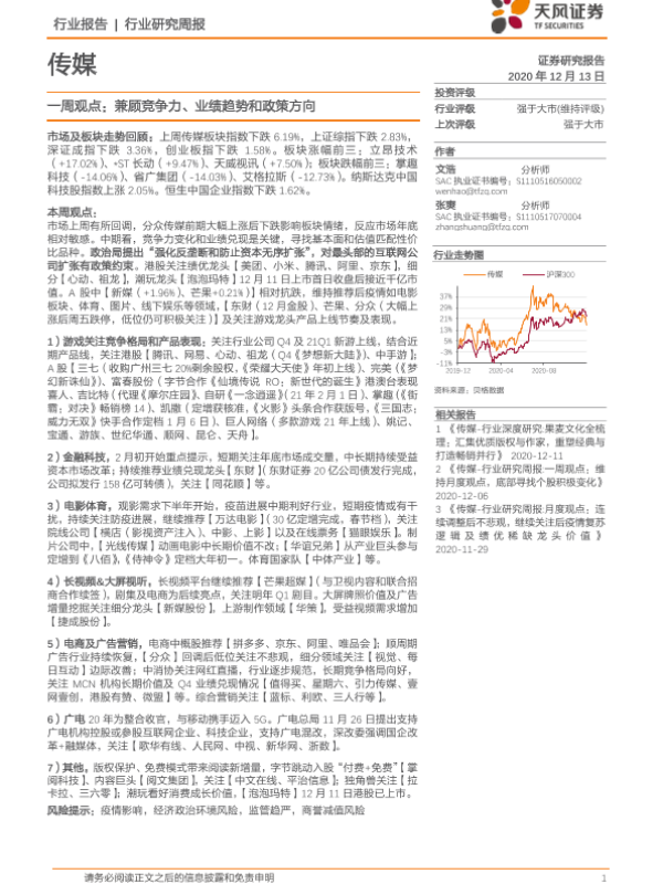 【天风证券】【20201213】传媒一周观点:兼顾竞争力、业绩趋势和政策方向-23页