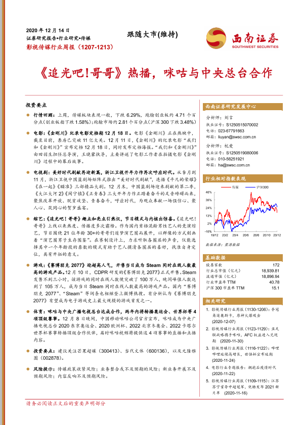 【西南证券】【20201214】20201214-西南证券-影视传媒行业周报:《追光吧!哥哥》热播,咪咕与中央总台合作-22页