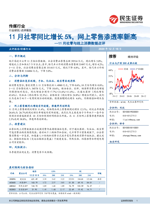 【民生证券】【20201216】11月社零同比增长5%,网上零售渗透率新高-3页