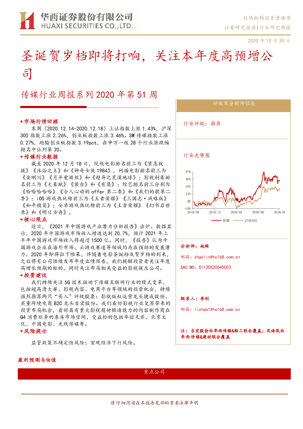 【华西证券】【20201220】20201220-华西证券-传媒行业周报系列2020年第51周:圣诞贺岁档即将打响,关注本年度高预增公司-15页