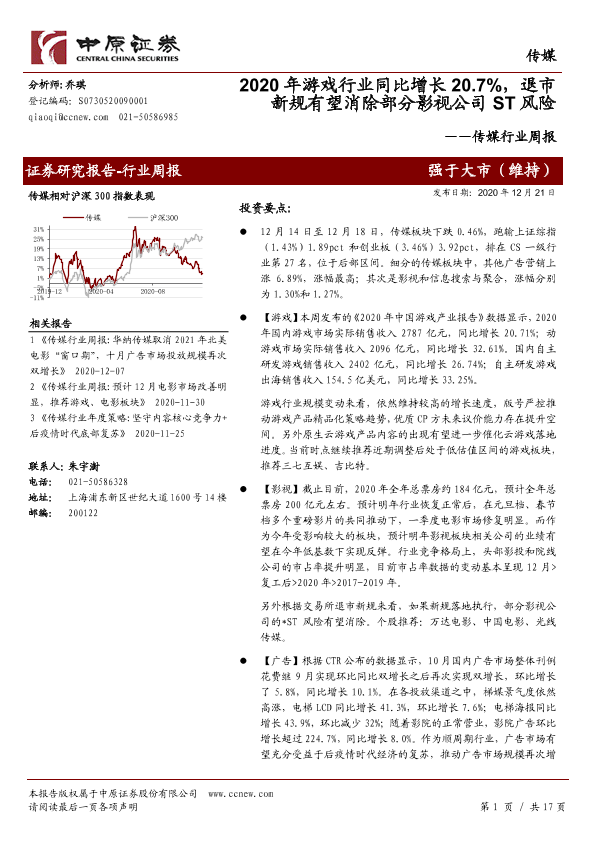 【中原证券】【20201221】2020年游戏行业同比增长20.7%,退市新规有望消除部分影视公司ST风险-17页