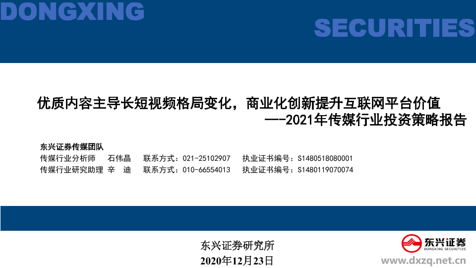 【东兴证券】【20201223】2021年传媒行业投资策略报告:优质内容主导长短视频格局变化,商业化创新提升互联网平台价值-59页