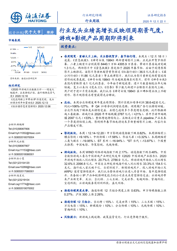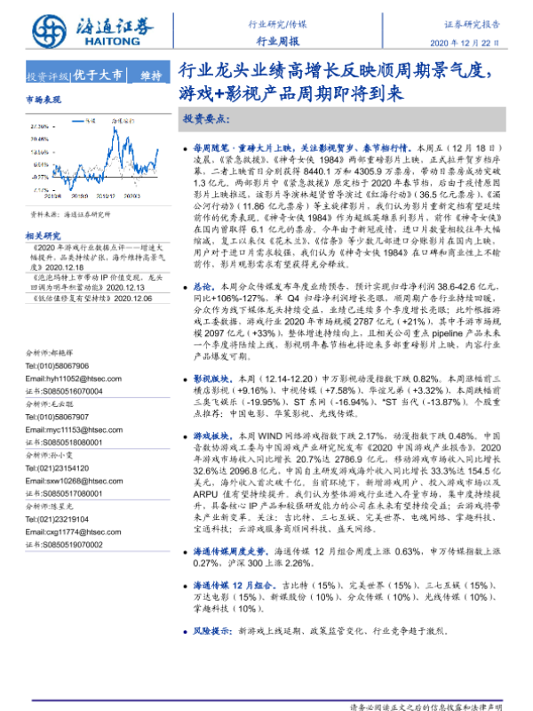 【海通证券】【20201222】20201222-海通证券-传媒行业周报:行业龙头业绩高增长反映顺周期景气度,游戏+影视产品周期即将到来-12页