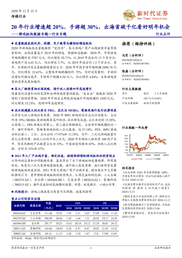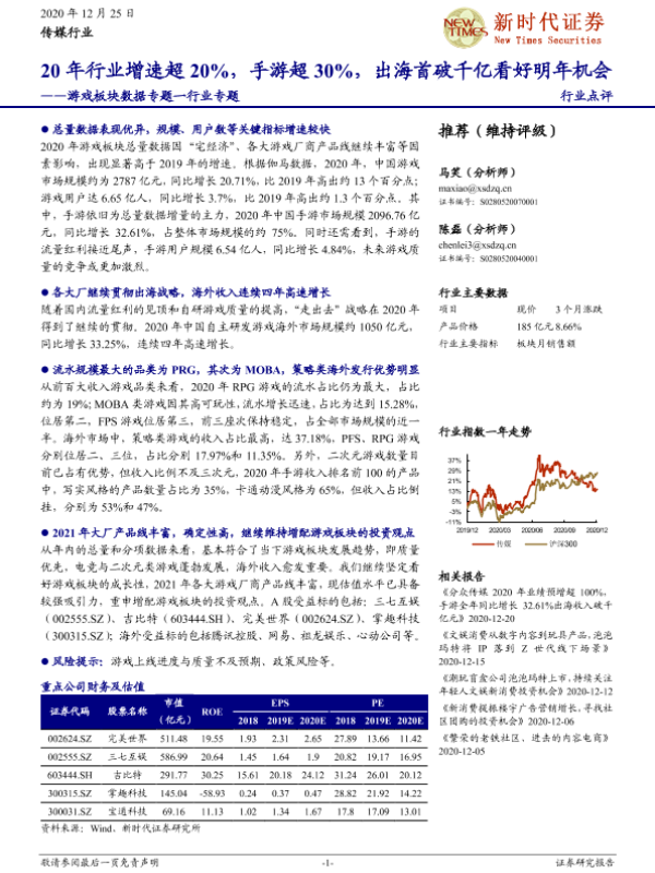 【新时代证券】【20201225】20年行业增速超20%,手游超30%,出海首破千亿看好明年机会-7页