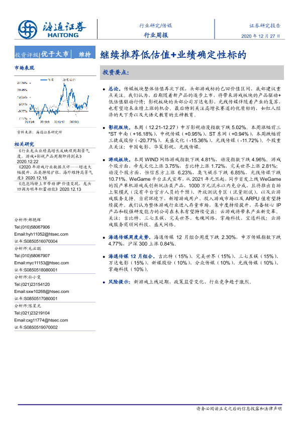 【海通证券】【20201227】20201227-海通证券-传媒行业周报:继续推荐低估值+业绩确定性标的-10页