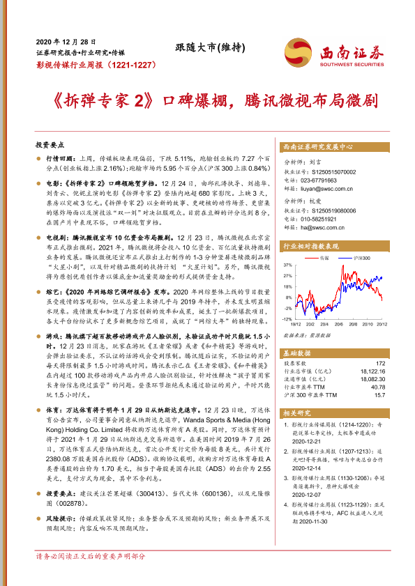 【西南证券】【20201228】20201228-西南证券-影视传媒行业周报:《拆弹专家2》口碑爆棚,腾讯微视布局微剧-22页