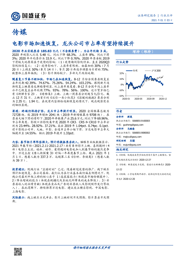 【国盛证券】【20210103】20210103-国盛证券-传媒行业点评:电影市场加速恢复,龙头公司市占率有望持续提升-13页
