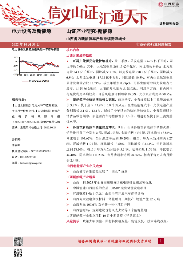 【山西证券】【20221031】电力设备及新能源行业山证产业研究_新能源:山西省内新能源车产销持续高速增长-41页
