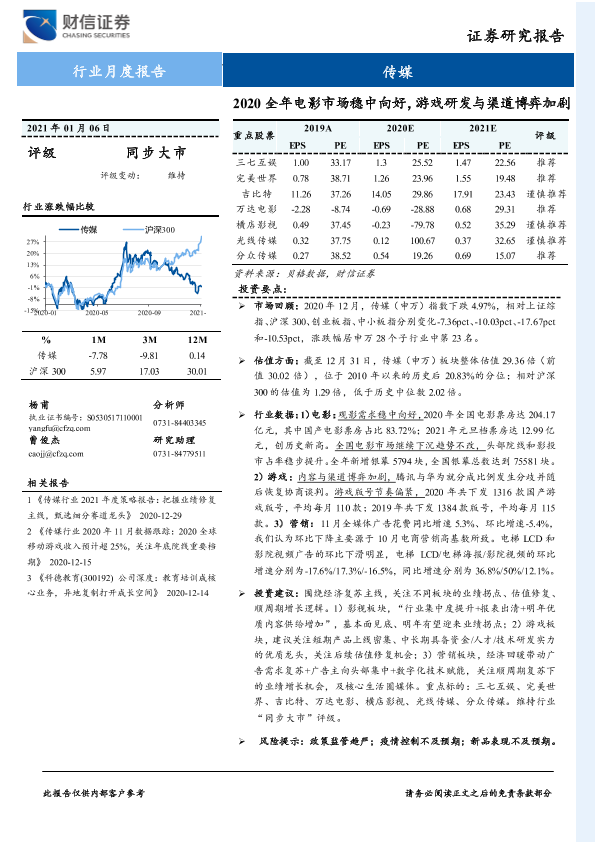 【财信证券】【20210106】20210106-财信证券-传媒行业月度报告:2020全年电影市场稳中向好,游戏研发与渠道博弈加剧-16页