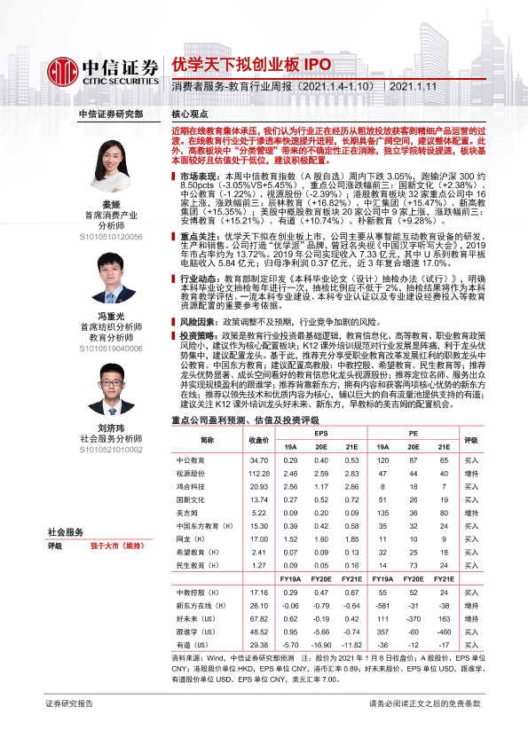 【中信证券】【20210111】消费者服务-教育行业周报:优学天下拟创业板IPO-14页