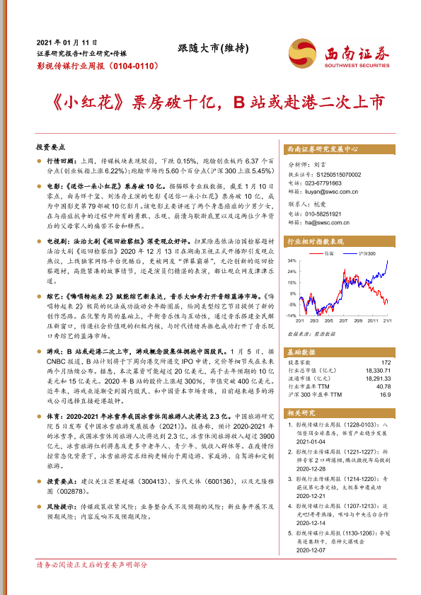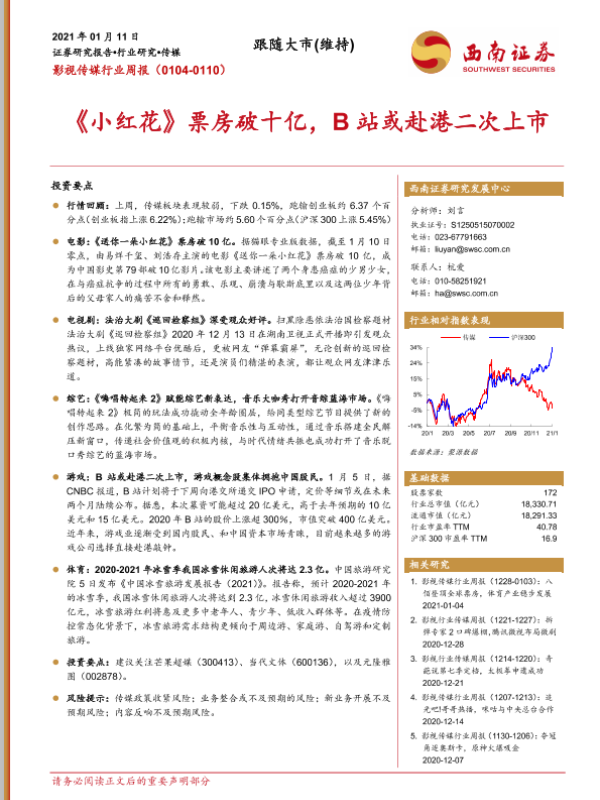 【西南证券】【20210111】20210111-西南证券-影视传媒行业周报:《小红花》票房破十亿,B站或赴港二次上市-24页