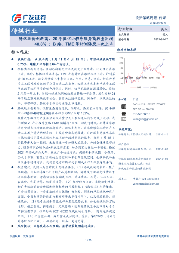 【广发证券】【20210117】20210117-广发证券-传媒行业:腾讯股价创新高,20年微信小程序服务商数量同增40.8%;B站、TME等计划港股二次上市-23页