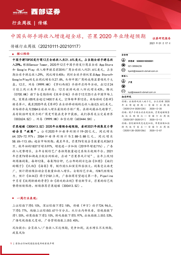 【西部证券】【20210117】20210117-西部证券-传媒行业周报:中国头部手游收入增速超全球,芒果2020年业绩超预期-14页