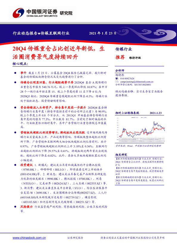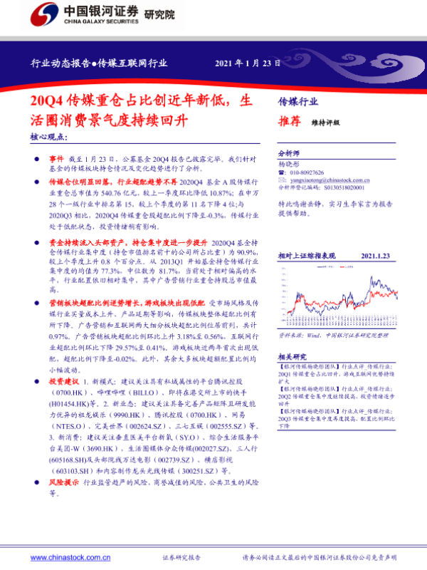 【银河证券】【20210123】20Q4传媒重仓占比创近年新低,生活圈消费景气度持续回升-11页