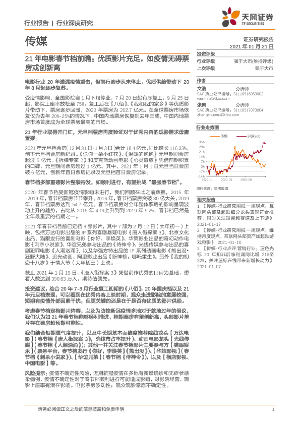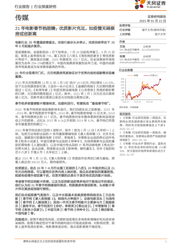 【天风证券】【20210121】21年电影春节档前瞻:优质影片充足,如疫情无碍票房或创新高-13页