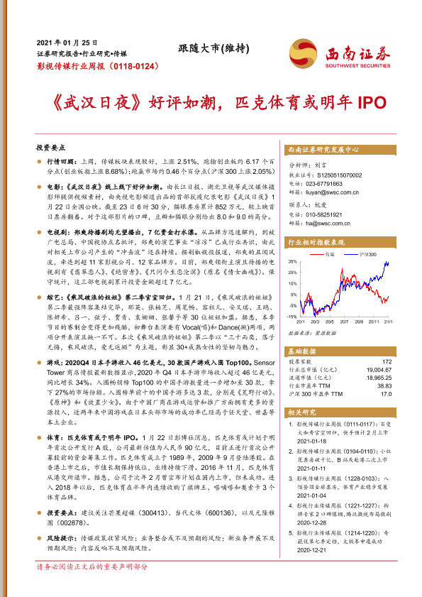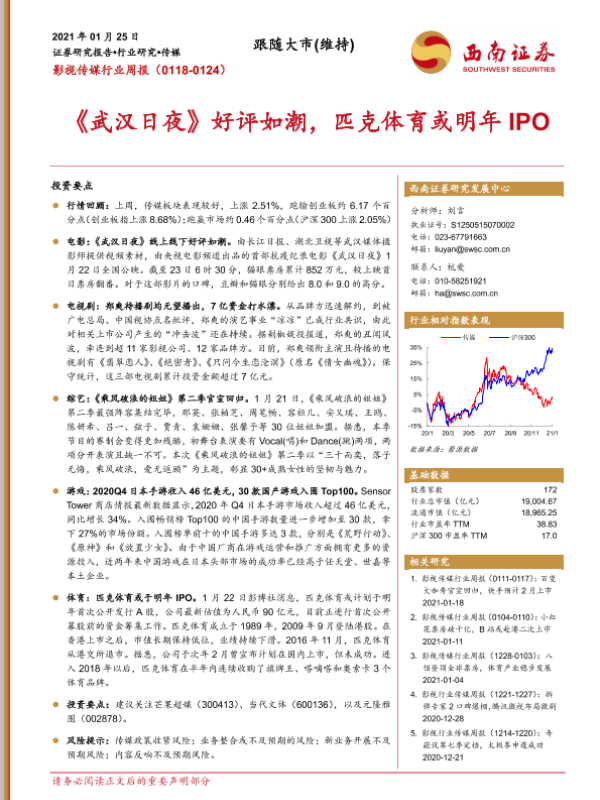 【西南证券】【20210125】20210125-西南证券-影视传媒行业周报:《武汉日夜》好评如潮,匹克体育或明年IPO-21页