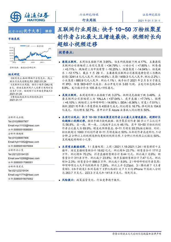 【海通证券】【20210131】互联网行业周报:快手10~50万粉丝聚星创作者占比最大且增速最快,视频时长向超短小视频迁移-13页